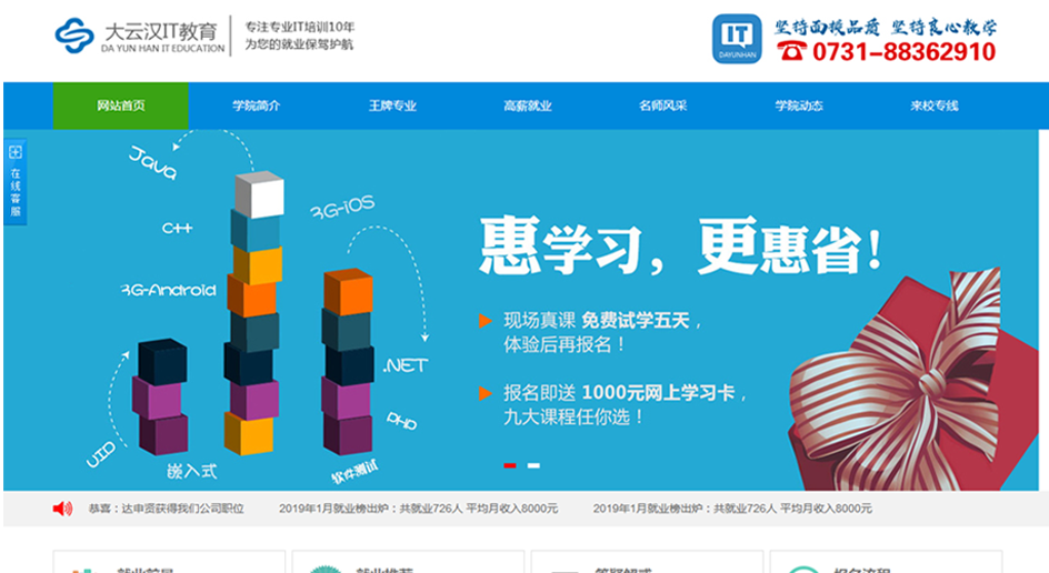 大云汉IT学院直属于大云汉教育集团,集团下辖教育产品事业部、市场就业事业部、技术研发事业部(新一代技术研发中心)、学术教质部、学生实习实训部、学生思政部、后勤保障部等多个核心部门,校企合作、专业共建在校学生3000余人,是新一代信息技术(软件开发、大数据、云计算、人工智能等)研发与服务、行业内领先的信息技术产教融合型企业;是一家集实践教学、社会培训、企业真实生产和社会技术服务于一体的高水平职业教育实训基地及人才服务提供基地;是国家工业和信息化部授予的全国信息化工程师-NACG数字艺术人才培训认证中心。前身为湖南计算机培训中心,成立于2009年,现总部位于湖南长沙黄金创业园,与本科院校、高职院校、中职学校开展校企合作、专业共建、学生实习实训、毕业生顶岗实习等,培养了一大批新一代信息技术人才。现已研发完成Python人工智能教育产品、新一代信息技术前端工程师教育产品、Java软件开发工程师教育产品,具有完全自主知识产权,先后获得15项国家专利授权和7项软件著作权登记。